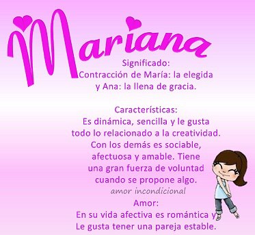 En el trabajo es la líder puede que comience desde el escalón más bajo pero sabe cómo hacerse notar por los jefes suele usar técnicas de todo tipo para lograr el cometido y no le da miedo que la juzguen por el contrario se siente bien cuando hablan de ella porque sabe que está llegando a la meta. Significado del nombre Mariana. Atracción por el pasado la historia y las antigüedades muy interesada y practicante del orden la organización el rigor la constancia y el amor al detalle.